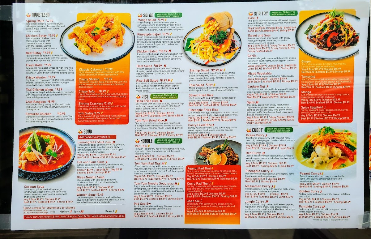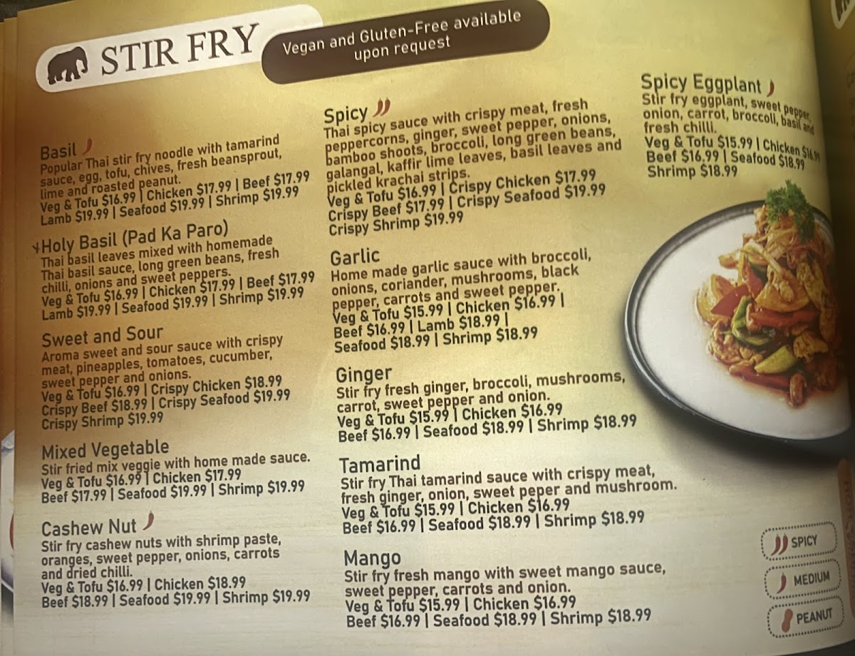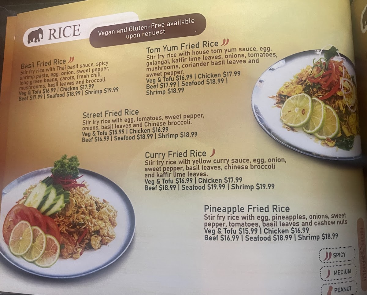 The Street Fried Rice is a crowd favorite, combining stir-fried rice with egg, tomatoes, sweet pepper, onions, basil leaves, and Chinese broccoli. And don't miss out on the flavorful Basil Stir Fry or the aromatic Massaman Curry.